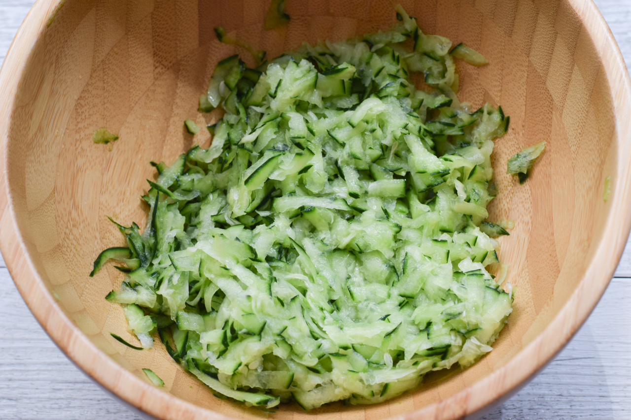 Die Gurke mit einer Raspel oder einem Hobel zerkleinern und in eine Schüssel geben. Leicht salzen.