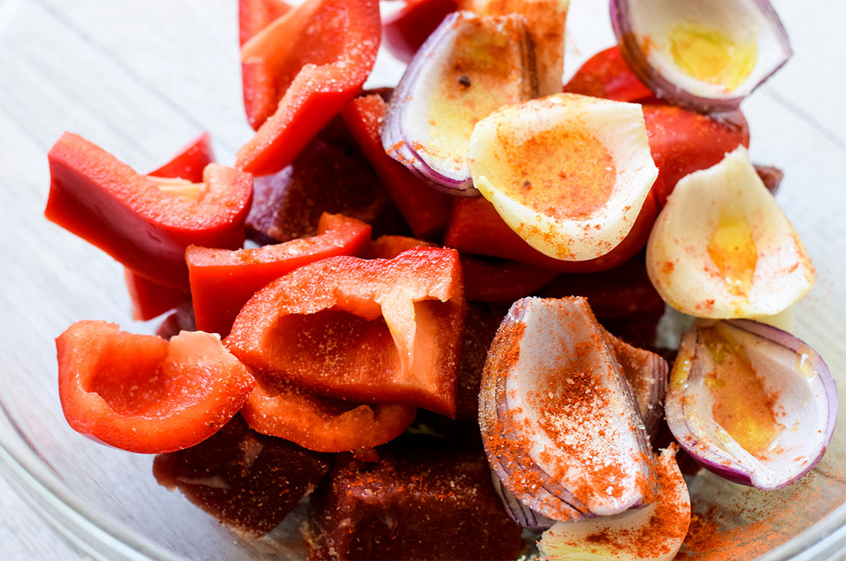 Die Zwiebeln grob würfeln und etwas auseinander brechen, so dass etwa immer zwei bis drei Schichten aneinander hängen. Knoblauchpulver, Paprikapulver, Salz, Pfeffer und Öl hinzufügen.