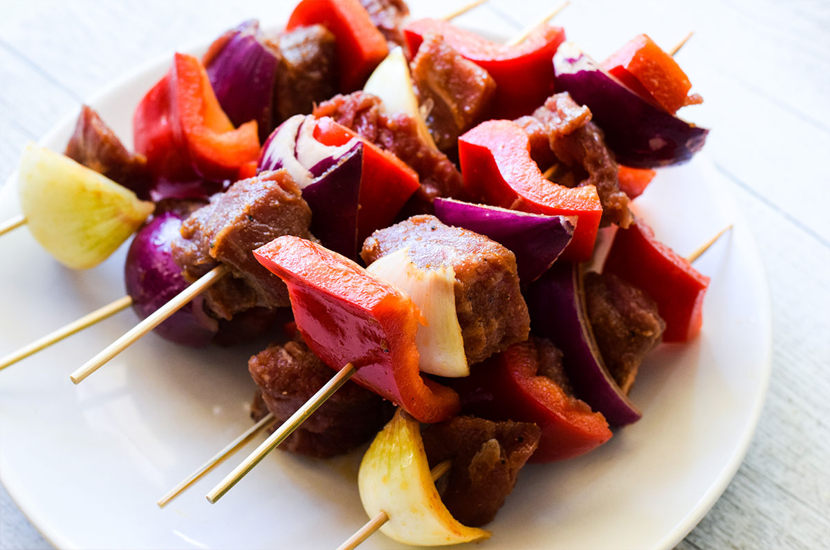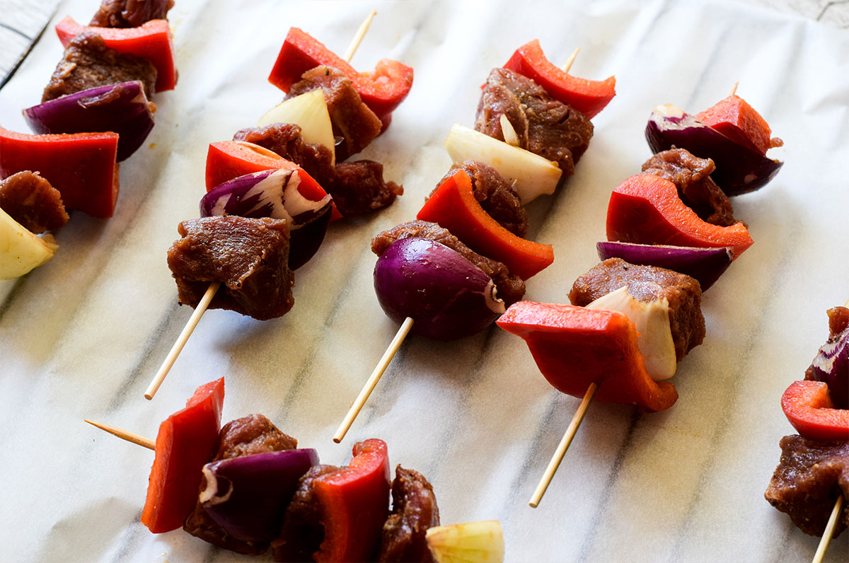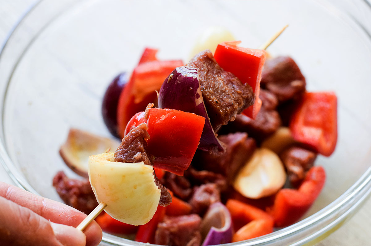 Abwechselnd Zwiebeln, Paprika und Rindfleisch auf Schaschlik-Spieße aufspießen, bis alles aufgebraucht ist.