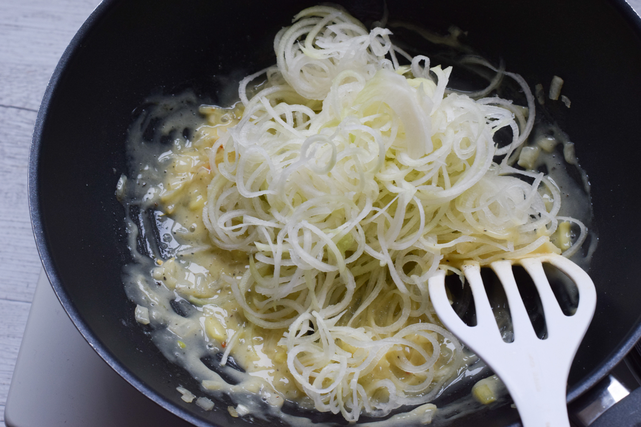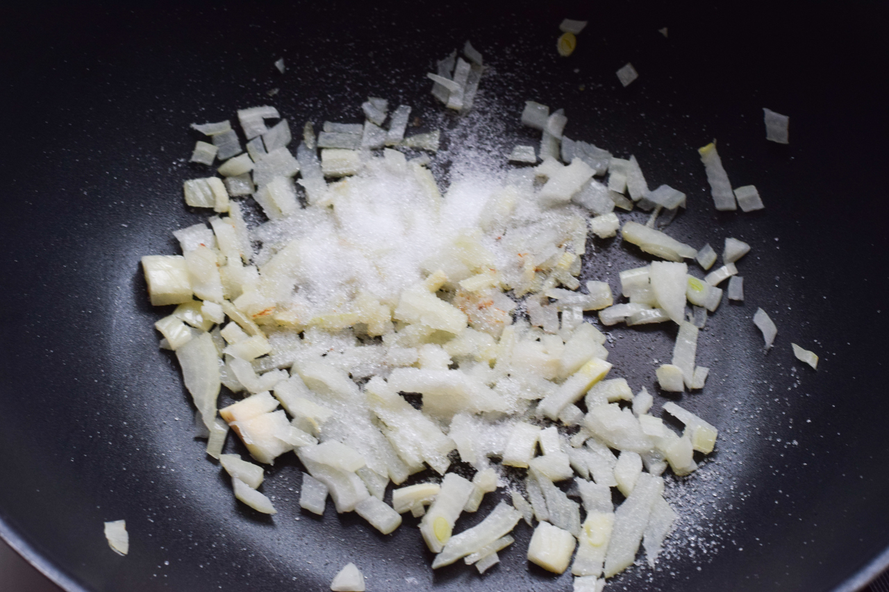 Die Zwiebel kleinhacken und in einer Pfanne glasig andünsten. 1 TL Erythrit darüber geben und etwas karamellisieren lassen.