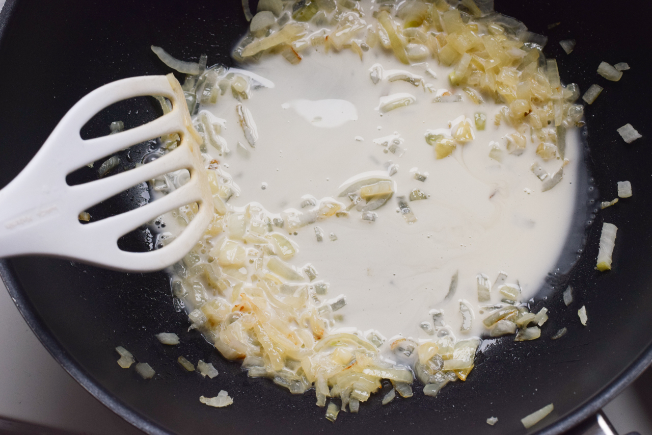 Mit Sahne aufgießen und optional Knoblauchpulver dazugeben.
