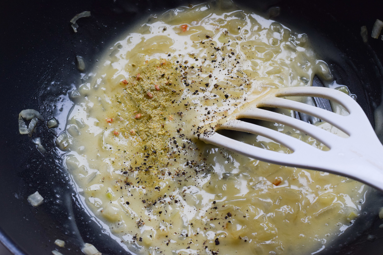 Gemüsebrühpulver und Pfeffer dazugeben und falls noch nötig, eine Prise Salz. Etwas eindicken lassen, falls die Sauce noch nicht cremig genug ist.