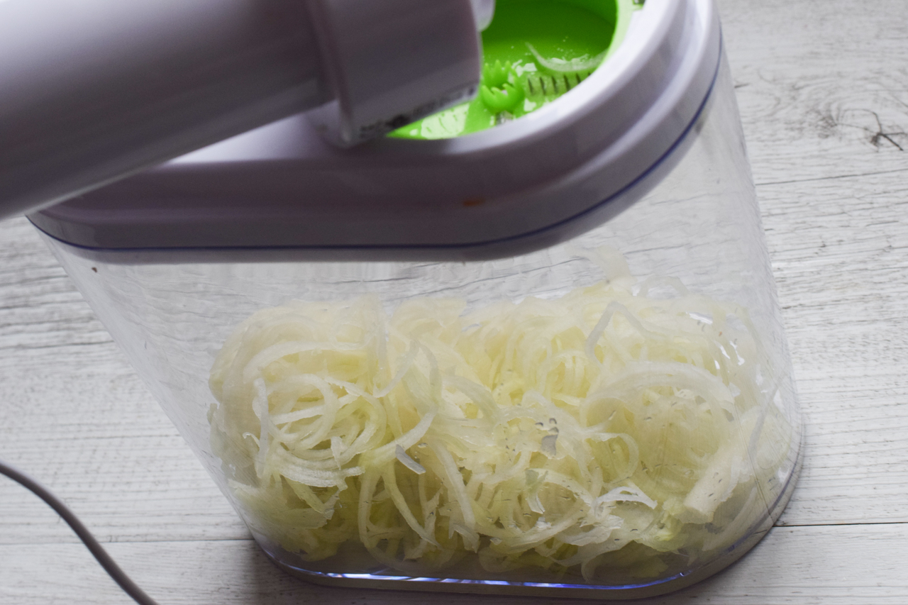 Den Kohlrabi mit Hilfe eines Spiralschneiders zu Kohlrabi-Spaghetti verarbeiten.
