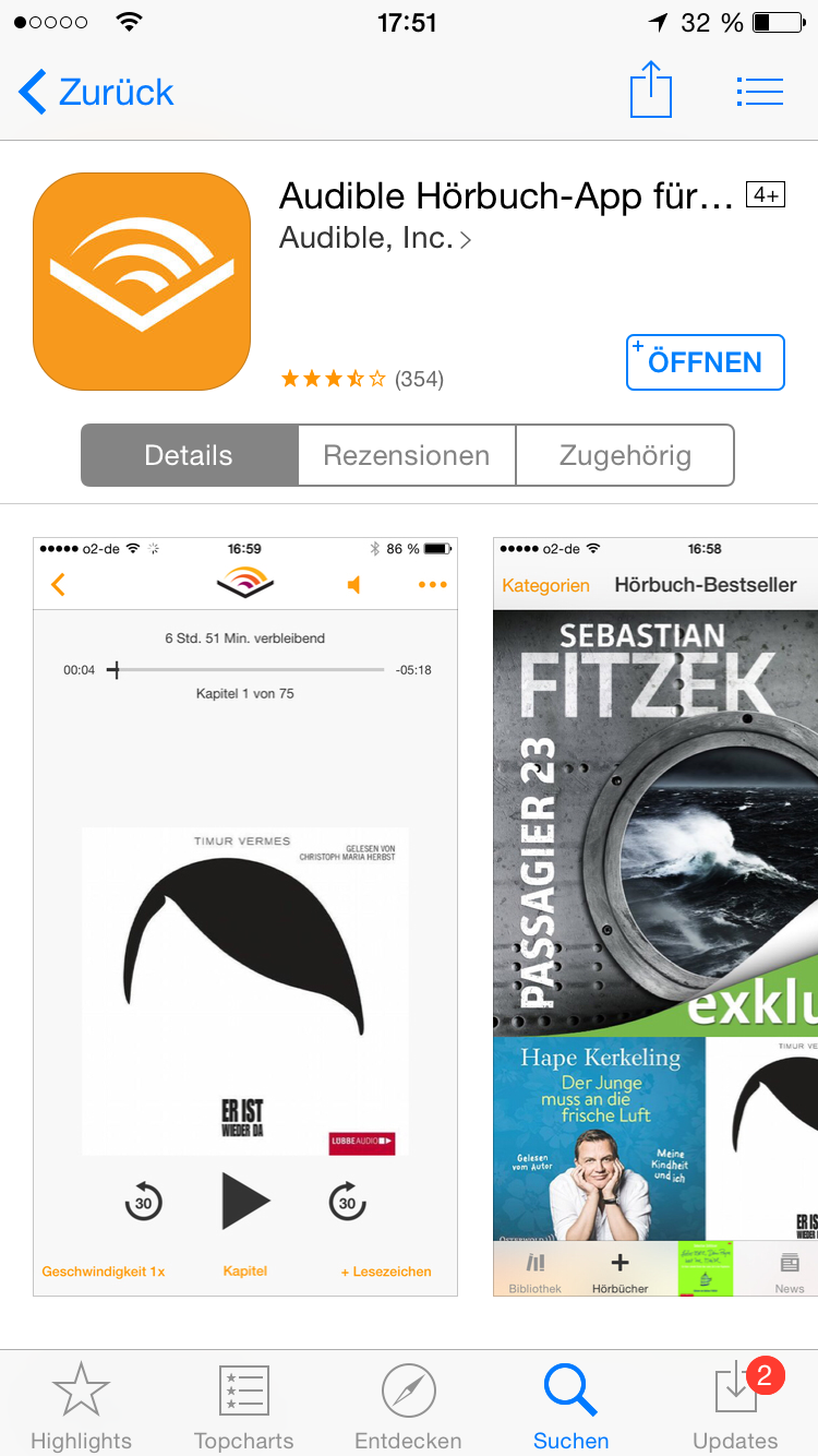 2015-09-03 17.51.14Gaaaanz einfach, wenn Du auch in den Genuss kommen willst und dich mit Hörbüchern motivieren willst, z.B. beim Sport, dann gehst Du in den App-Store beim Iphone oder in den Play-Store, wenn Du ein Android Handy hast und suchst nach Audible.