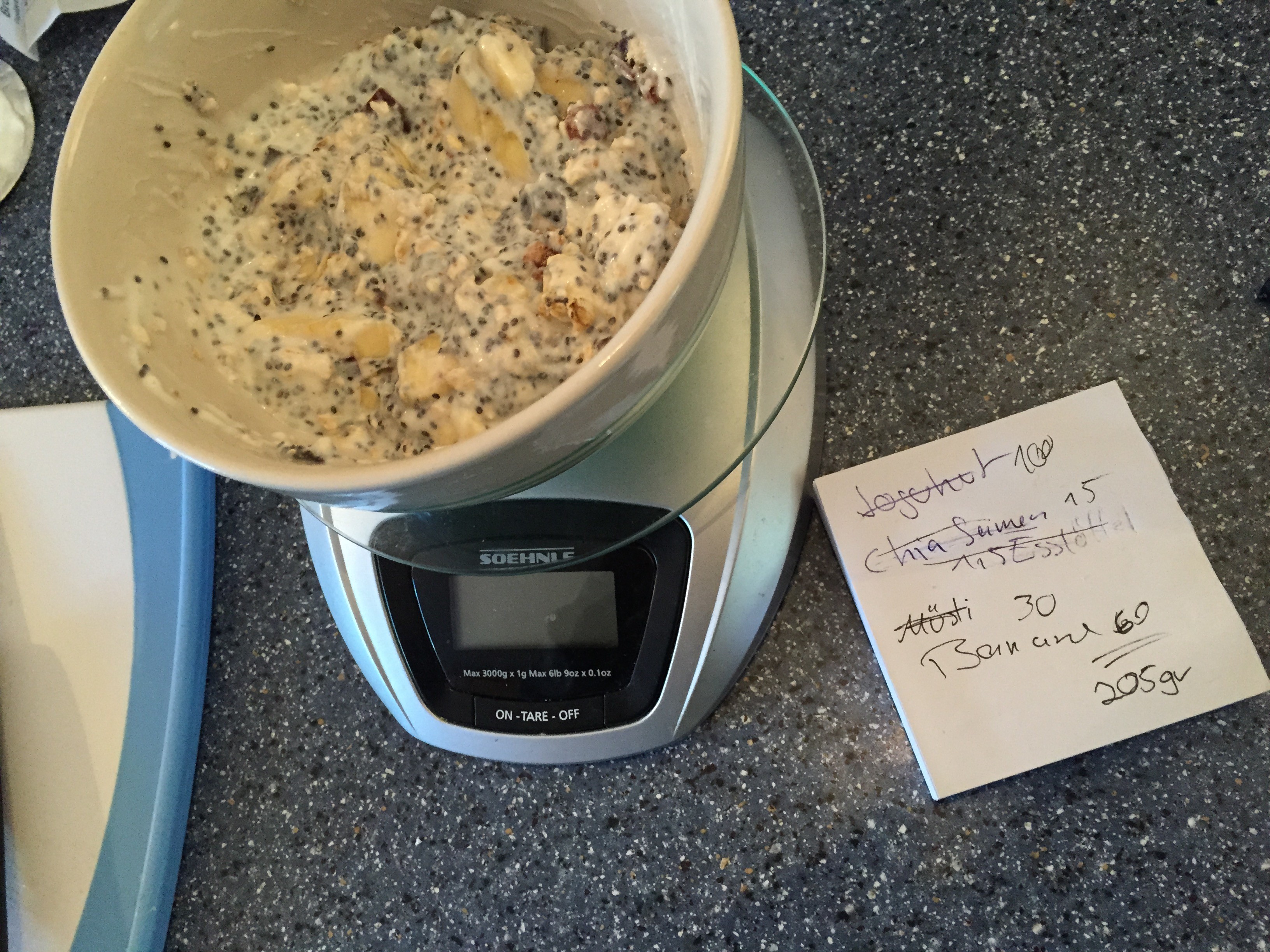 Morgens werde ich wie früher, eine kleine Schale mit Joghurt, Chia-Samen, etwas Müsli und vor allem leckeren Saisonalen Obst essen. Roundabout 200-400g, so dass ich satt bin.