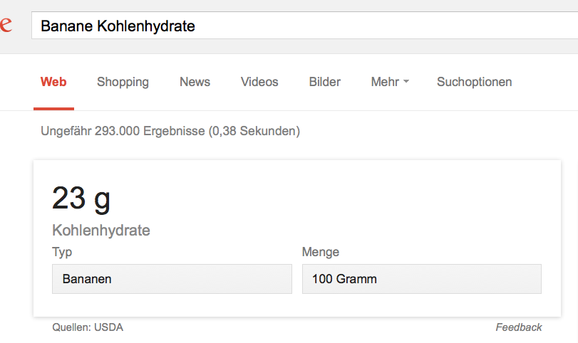 Test Google Kohlenhydrate BananeWie Du siehst, wird in der Regel schon von Google angegeben, wie viel Kohlenhydrate welches Lebensmittel hat. Allerdings bin ich nicht so der Fan von den Werten die Google verwendet, also gehe ich auf einen der nachfolgenden Seiten und überprüfe ob die Kohlenhydrate korrekt sind, musst Du aber nicht. Oder ich gebe bei Google „fddb Lebensmittel“ ein. Fddb ist eine riesige Datenbank die sämtliche Lebensmittel beinhaltet und oft sogar portionsmäßig die Kohlenhydrate angibt.