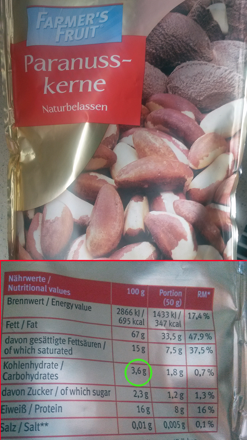 Ich empfehle die Paranüsse, meine auf dem Bild haben sogar nur 3,6 g Kohlenhydrate pro 100g und sind super lecker! 😉
